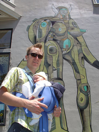 As a son, I've always tried to make sure that my Dad knows that I'm thinking of him on Father's Day. Growing up, when we lived in the same house, and were together on a day to day basis, this was a piece of cake. These days it's a bit different though. Father's Day now usually means a phone call and an Amazon gift certificate (which he can put towards that next big ticket tech item ;o). More often than not this makes me feel like a bit of a chump, like my Dad deserves at least some face time with me and Matt on this day... but given that we live 3000+ miles apart, the chances of all of us being together on Father's Day are somewhat minimal. I know that he knows this, but I'm sure it bums him out a bit.Experiencing this day on the other side of the fence for the first time as a father definitely put a different perspective on things. On the one hand, I feel that we really don't need a holiday with more presents and more commercialization to tell us how awesome it is being a Dad. But on the other, it is pretty amazing to be able to take a day out to give respect to all the Dads of the world. I know I finally appreciate it like I never have before. And who woulda thunk that it would be so cool to be walking around our neighborhood in SF, with my boy in the Baby Bjorn, givin' out, "Hey, Happy Father's Day!" to a bunch of dudes my age who were doing the same thing? I know I didn't.